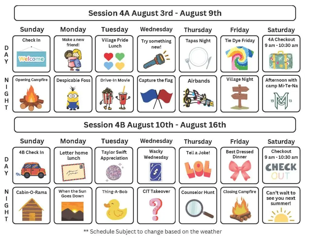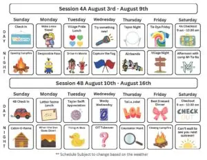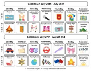 Every session at camp we feature a variety of evening activities, theme days, and special events. Pirates, the old west, brain games, camp Olympics, carnivals and cabin challenges have all been major features of our program calendars in years past. These events allow campers to compete, connect and create in addition to the daily activities. Please check out our sample schedule below as well as some schedules from previous seasons. New program calendars will be posted at least 2 weeks prior to the start of each session. This allows campers and their families an opportunity to prepare for the special activities that will happen during their time at camp.